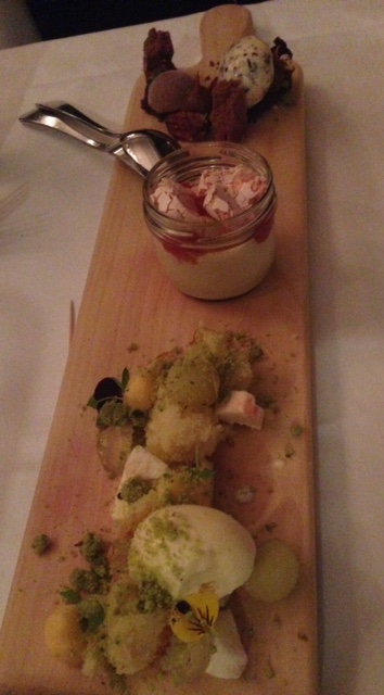 To follow we availed of the interesting dessert tasting plate, which allowed you to try a few of the chef’s delights…one of which was the simply gorgeous deconstructed apple mousse, sponge cake with limoncello, pistachio crumbs and a yummy lemon gelato. Another rather unique dessert on the board was a Ruby grapefruit yogurt with blood orange pavlova, Campari jelly and citrus (gosh you just want to be in a gondola cruising down the canals in Venice whilst eating this).